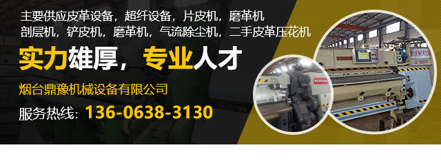 煙臺鼎豫機械設備有限公司位于山東省煙臺市芝罘區楚玉路238號泰和工業園,我公司主要經營皮革機械設備,超纖設備及配件的生產,銷售。我們有好的產品和專業的銷售和技術團隊,主要供應皮革設備,超纖設備,片皮機,磨革機,剖層機,鏟皮機,磨革機,氣流除塵機,二手皮革壓花機。我們具有專業維修國內外各種型號精密片皮機的技術和能力,承攬大中小維修機械的業務。定制各種型號帶刀、砂輪等。